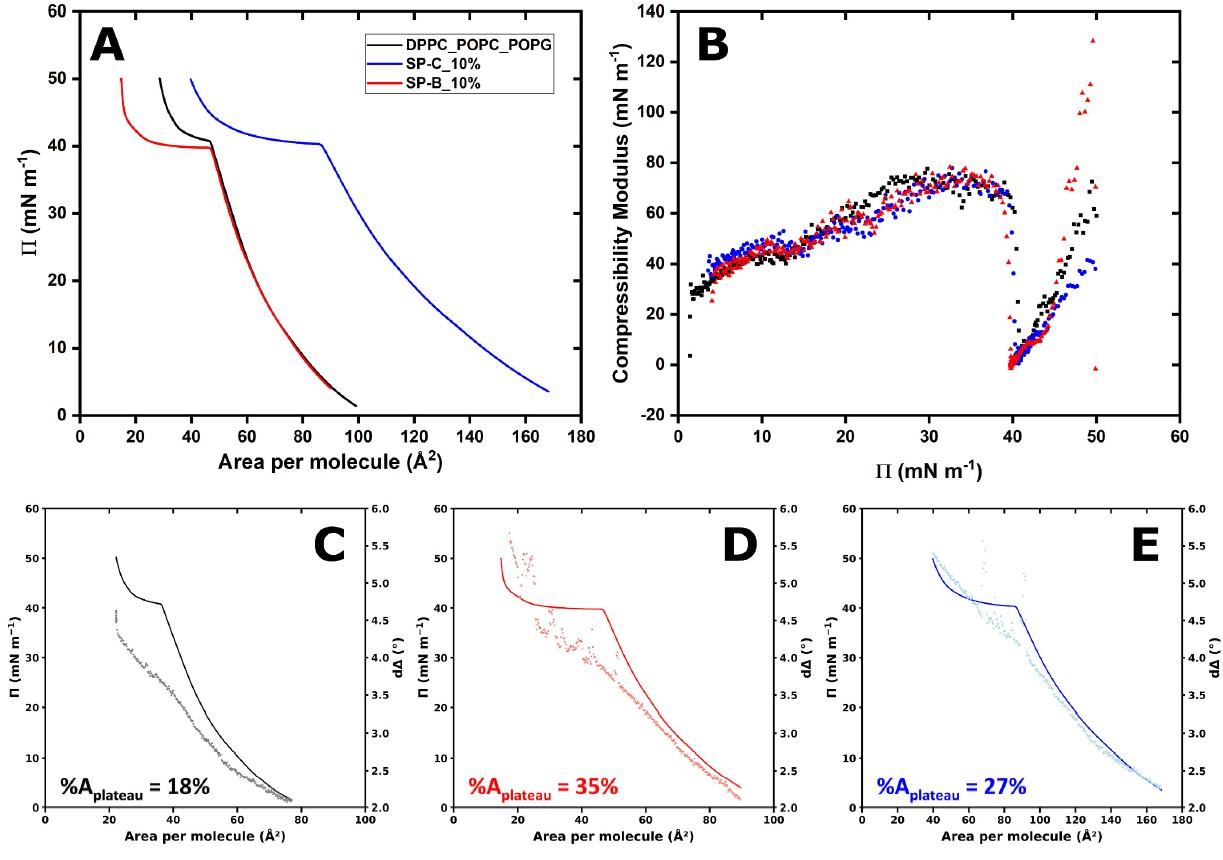 LB膜分析儀可獲取表面壓力-面積(Π-A)等溫線,直接用于測量模型單層膜(純脂質、脂質+SP-B、脂質+SP-C)的壓縮Π-A等溫線。等溫線顯示,所有系統在壓縮至約40 mN/m時均出現一個明顯的平臺區,這對應于單層膜從二維向三維結構的轉變(buckling-dominated collapse),模擬了生理呼氣末期的膜重組過程。通過計算平臺區壓縮面積占總面積的百分比(%Aplateau),研究人員量化了SP-B和SP-C在穩定三維結構能力上的差異。結果表明SP-B系統的%Aplateau(35%)顯著高于SP-C系統(27%)和純脂質系統(18%),直接證明了SP-B在促進和穩定膜儲備庫形成方面具有更強大的能力。與橢圓偏振測量聯用,研究中,將Beaglehole Picometer Light Ellipsometer與Kibron G2槽聯用,實時監測壓縮過程中光學參數d△的變化。