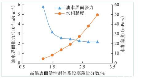 圖2 ACS-2高黏表面活性劑體系含量對(duì)界面張力和水相黏度的影響