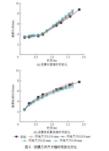 為了進行網格尺寸獨立性分析,在計算域尺寸為21 mm×66 mm時,將網格尺寸分別設置為0.06、0.03、0.018和0.014 mm。在實驗中的碰撞條件為顆粒直徑dp=3 mm,液滴直徑dd=3.93 mm,接觸角θ=168.4°,撞擊速度v0=4.17 m/s。在上述相同碰撞條件下,利用不同網格尺寸開展數值模擬,并測量不同時刻下液膜長度和液膜底部直徑的變化數據進行對比,如圖3所示。如圖4所示,隨著網格尺寸降低,數值模擬結果與實驗結果趨于重合。當21 mm×66 mm計算域的網格尺寸達到0.014 mm時,數值模擬結果與實驗結果之間的偏差低于5%,圖5a對比了網格尺寸為0.014 mm時模擬得出的液滴形態(tài)與實驗中拍攝的液滴形態(tài),兩者具有較高的吻合度。故后續(xù)模擬中均按此比例生成計算域網格。