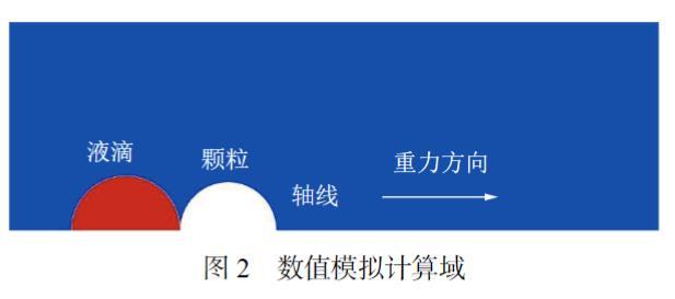 如圖2所示,液滴與顆粒對心碰撞時,流場在演變過程將始終保持軸對稱狀態(tài),因此設置了二維軸對稱計算域。在相同的網格數量條件下,二維軸對稱計算域相較于三維計算域具有更好的網格質量和計算精度。在分析計算結果時,可以通過鏡像操作得到中軸線截面上的整體流場圖像。由于實驗中最大雷諾數的數量級為104,因此,依據PASANDIDEH-FARD等的研究結果,可認為在塵?霧碰撞過程中流場處于層流狀態(tài)。
