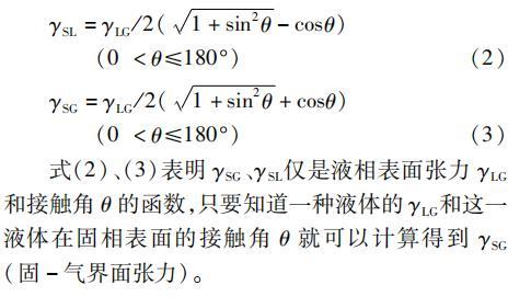 式(2)、(3)表明γSG、γSL僅是液相表面張力γLG和接觸角θ的函數(shù),只要知道一種液體的γLG和這一液體在固相表面的接觸角θ就可以計(jì)算得到γSG(固-氣界面張力)。