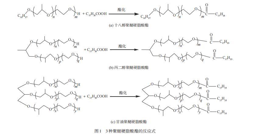 稱取一定質量的聚醚包括不同脂肪醇聚醚、丙二醇聚醚和甘油聚醚,同不同脂肪酸置于500 mL的反應燒瓶內,攪拌,升溫,當溫度上升至80℃時,加入0.2%(相對于體系總質量)的對甲苯磺酸作為催化劑,改變體系狀態為真空,壓力在?0.095 MPa以下。繼續升溫至140℃,保溫4 h,然后降溫至60℃,加入NaHCO?中和催化劑,繼續攪拌降溫至室溫,得到聚醚脂肪酸酯(以下簡稱聚醚酯)消泡劑。以硬脂酸為例合成的不同聚醚酯如圖1所示。