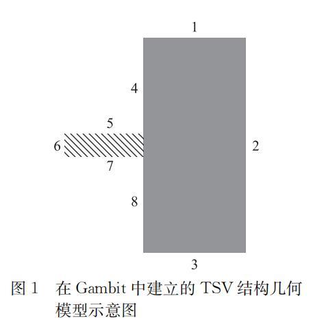 按照實際電鍍液及樣片的情況,在流體仿真軟件中進行建模。主要分為2個部分:前處理軟件Gambit中對平面模型的建立,Fluent中對流場進行具體解算。本文截取TSV軸對稱結構的中心軸截面,建立二維分析模型,直接反應實際TSV的浸潤過程。同時,基于對比實驗考慮,忽略電鍍液組分與被浸潤表面化學反應造成的界面影響,并直接采用與電鍍液物理性質基本相同的水作為液相組分。氣相組分中采用理想不可壓氣體假設模擬正常大氣壓下的操作環境。建立的Fluent分析模型如圖1所示。其中較小的矩形塊代表TSV,4~8代表被潤濕表面。初始情況下,所有被模擬區域為氣相區域,之后液相從邊界3以特定流速進入(除流速討論單元,其余均設置為0.05 m/s),逐步潤濕全部或局部表面,直至從邊界1流出。具體設置為邊界1為壓力出口,2為對稱邊界,3為速度人口,4、5、6、7、8均為壁面邊界條件。表面張力和接觸角均采用實際測量值0.06 N/m,64°;重力加速度為9.81 m/s2,方向為豎直向下。
