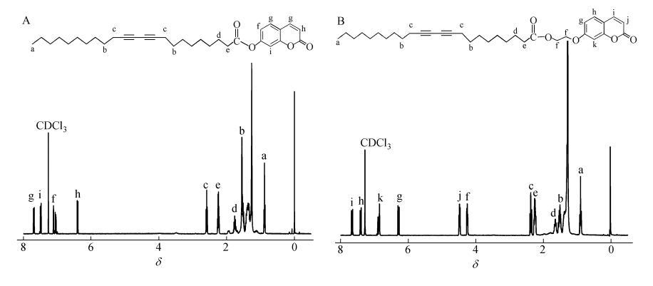 2類香豆素取代二乙炔單體參照文獻(xiàn)所述方法合成,分子結(jié)構(gòu)及產(chǎn)物核磁譜圖如圖1所示。將2種產(chǎn)物分別溶于氯仿,配成1mg/mL的溶液。亞相為超純水(18.2MΩ·cm)。所有的π-A曲線和LB膜拉制實(shí)驗(yàn)均為20℃條件下在KSV Mini-trough LB膜儀上進(jìn)行。溶劑充分揮發(fā)后,膜障以5 mm/min的速率對(duì)其壓縮,在20℃和恒定膜壓35 mN/m下以2mm/min速率沉積Y-型LB膜?;瑸槭⑵?。薄膜的聚合是在16W的紫外燈(波長(zhǎng)254nm)輻照下完成的,薄膜表面距離燈管下緣10cm,輻照時(shí)間5min。