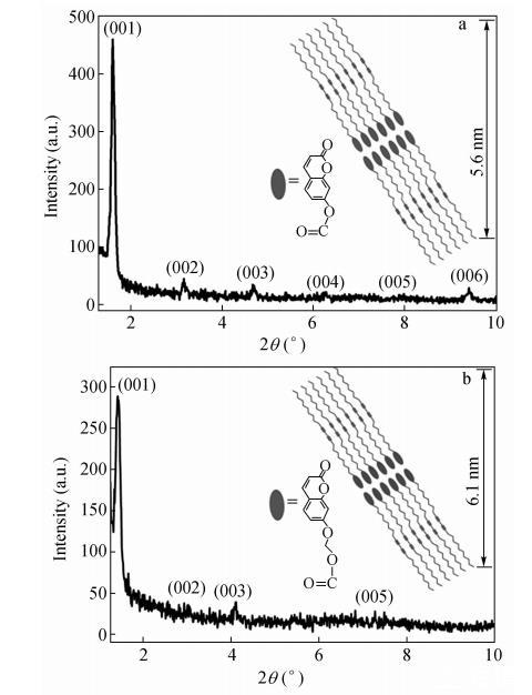 通過垂直沉積法在35mN/m的膜壓下,將氣-液界面上的單層膜轉移到石英片上,制備CODA和CO2DA多層LB膜。81層CODA和CO2DA LB膜的小角X射線衍射圖如圖3所示。
