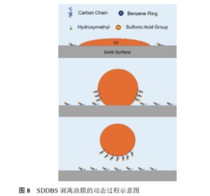 如圖8所示,SDDBS剝離油膜機理可從以下三個方面進行闡釋,首先SDDBS吸附在油水界面上降低了油水界面張力;其次,SDDBS的二羥基通過氫鍵作用強化了其與巖石表面吸附,磺酸基團富集于巖石表面使得巖石表面由親油轉變為強親水,極大地增加了油滴在巖石表面接觸角,降低粘附功而使得油膜易于剝離;最后,由于SDDBS在油水界面和巖石表面同時吸附,增加剝離后油滴與巖石表面間的靜電斥力,使得剝離后油膜不易重新粘附壁面,實現高效剝離。