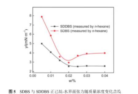 圖5 SDBS與SDDBS正己烷-水界面張力隨質量濃度變化曲線