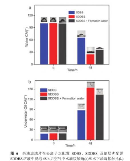 親油處理后玻璃片的空氣中水滴接觸角為100.2°,水下油滴接觸角為19.2°,為疏水親油性質.將親油玻璃片分別浸泡在0.02%(w)去離子水配置的SDBS、SDDBS溶液和地層水配置的SDDBS溶液中48 h,使用接觸角測量儀分別測量不同處理時間下其水滴接觸角及水下油滴接觸角.結果如圖6所示.SDDBS潤濕性調控能力較SDBS有較大提升,處理后空氣中水滴接觸角由65.1°降至24.5°,水下油滴接觸角由87.3°升至153.9°.經SDDBS處理后的玻璃片呈現親水/水下強疏油性質.為探究鹽對界面潤濕調控性能的影響,使用地層水配置的SDDBS溶液處理親油玻璃片,結果表明處理后空氣中水滴接觸角為35.6°,水下油滴接觸角為133.6°,說明地層水的引入降低了SDDBS對親油表面的親水疏油調控效果.這是由于地層礦化度條件下,SDDBS分子鏈團聚影響界面吸附,導致潤濕調控能力略有下降.