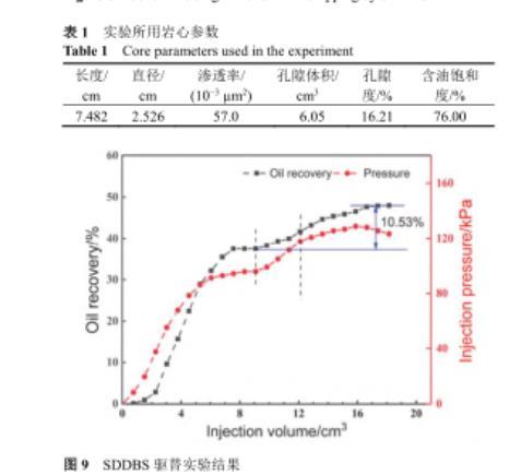 結(jié)合上述研究,選取0.02%(w)SDDBS溶液作為驅(qū)油劑進行巖心動態(tài)驅(qū)替實驗.本實驗使用的巖心參數(shù)如表1所示.驅(qū)替實驗共分為三個過程:模擬地層水驅(qū)、表面活性劑驅(qū)、后續(xù)模擬地層水驅(qū).驅(qū)替結(jié)果如圖9所示,初期地層水驅(qū),當采出液含水率>98%時,計算采收率為37.36%.當注入3.025 cm3 SDDBS溶液后采收率提高至41.67%,注入壓力升高.恒溫保持12 h后進行后續(xù)水驅(qū),注入壓力逐漸升高,且當采出液含水率>98%時,計算采收率為47.89%.說明SDDBS溶液驅(qū)在水驅(qū)基礎上提高采收率10.53%,具有優(yōu)異的驅(qū)油效果.