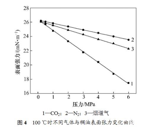 6)在一定的壓力和溫度條件下,每個(gè)煙道氣-稠油系統(tǒng)的表面張力測定重復(fù)3次,以保證較好的重復(fù)性。