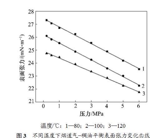 為了研究溫度和壓力對煙道氣-稠油平衡表面張力的影響,分別在80,100和120℃下進(jìn)行實(shí)驗(yàn),圖3所示為不同溫度下煙道氣-稠油平衡表面張力隨壓力變化曲線。由圖3可見:當(dāng)氣體壓力從0.2 MPa升高到6MPa,在80℃時(shí),煙道氣-稠油表面張力由27.31mN/m減小到23.53mN/m,降低了13.84%;在100℃時(shí),煙道氣-稠油表面張力由26.10mN/m減小到22.26mN/m,降低了14.71%;在120℃時(shí),煙道氣-稠油表面張力由 24.75 mN/m減小到 21.75 mN/m,降低了12.12%。當(dāng)溫度一定時(shí),煙道氣-稠油系統(tǒng)的平衡表面張力隨著壓力的增大而減小,并呈較好的線性關(guān)系。這是因?yàn)闇囟纫欢〞r(shí),壓力增大,煙道氣在稠油中的溶解度增大,使得平衡表面張力減小。當(dāng)壓力一定時(shí),煙道氣-稠油系統(tǒng)的平衡表面張力隨溫度的升高而減小。這是因?yàn)闊煹罋獾闹饕煞质荖2,N2在稠油中的溶解度隨著溫度升高而增大。