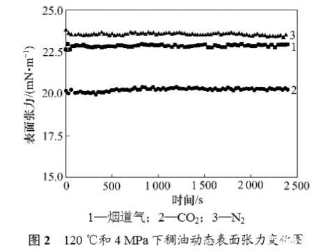 由于煙道氣在原油中具有一定的溶解度,油滴形成后,煙道氣會(huì)向原油中擴(kuò)散、溶解,一直持續(xù)到油滴被煙道氣飽和。為了檢測氣體向原油中溶解、擴(kuò)散對表面張力的影響,對煙道氣-稠油系統(tǒng)的動(dòng)態(tài)表面張力進(jìn)行測定。圖2所示為120℃和4MPa下測量的煙道氣-稠油動(dòng)態(tài)表面張力,其中煙道氣組成為80%N2+20%CO2(摩爾分?jǐn)?shù)),并與CO2-稠油和N2-稠油的表面張力進(jìn)行對比。
