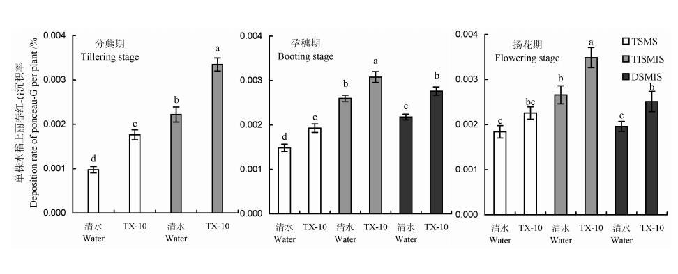清水的表面張力為71.80mN/m,用清水配制的麗春紅-G溶液的表面張力高于水稻葉片臨界表面張力。用100mg/LTX-10溶液配制的麗春紅-G溶液表面張力低于水稻葉片臨界表面張力。從圖4可以看出,與噴灑清水配制的麗春紅-G溶液相比,在水稻3個生育期,采用相同噴霧方法噴灑TX-10溶液配制的麗春紅-G溶液,都增加了水稻植株上麗春紅-G的沉積率。以在水稻生長量較小的分蘗蘗期增加幅度最大,其中手動噴霧器壓頂噴霧增加了80.85%,彌霧機下傾噴霧增加了50.83%,差異達顯著水平(F=57.17>F0.01=26.18,df=3,116,P<0.01)。