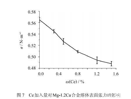 本研究測量了不同Ce含量對Mg-1.2Ca鎂合金熔體表面張力的影響.熔體表面張力的測量在730℃、大氣壓下進(jìn)行,采用最大氣泡壓力法.其測試結(jié)果如圖7所示,可以看出隨著Ce含量的增加,Mg-1.2Ca-xCe熔體表面張力不斷下降.這與Ce含量在鎂合金熔體表面富集,提高熔體表面表面活性有直接關(guān)系.