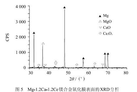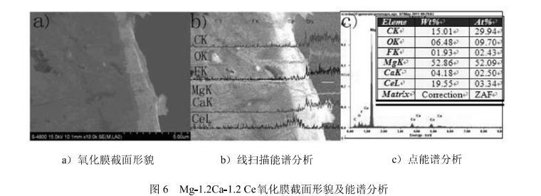 4)通過氧化膜的截面檢測和熱力學(xué)計(jì)算分析得出Mg-1.2Ca-1.2Ce的形成的氧化膜大致分為3層:外層是MgO,中間層是CaO,內(nèi)層是Ce2O3。