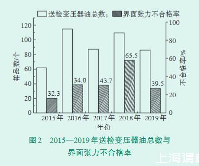2015—2019年送檢變壓器油總數與界面張力不合格率如圖2所示,不合格率均高于30%,其中2018年高達65.5%。