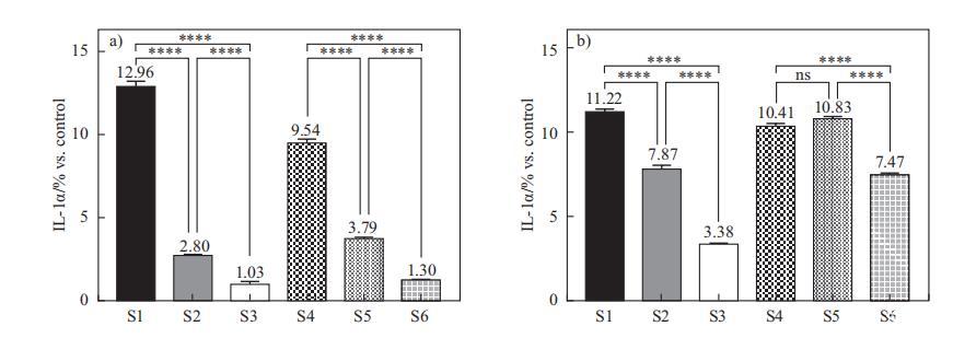 IL-1a值是從用稀釋的表面活性劑復(fù)合物S1-S6(濃度為0.015%和0.020%)處理24小時(shí)后收集的上清液進(jìn)行分析的。選擇的處理濃度是細(xì)胞仍然存活,同時(shí)可以觀察到IL-1a釋放差異的濃度(數(shù)據(jù)未顯示)。IL-1a值與未經(jīng)任何處理的對(duì)照樣品校準(zhǔn)后進(jìn)行比較。如圖4所示,在表面活性劑復(fù)合物中加入海藻糖脂(S3和S6)可顯著減少二元體系S1和S4的細(xì)胞因子釋放。但在SMCT/CAPB體系中加入DG(S4 vs S5)在0.02%時(shí)并未抑制IL-1a釋放。此外,海藻糖脂比DG更能降低IL-1a釋放,且差異顯著(S3 vs S2,S6 vs S5)。在濃度效應(yīng)方面,它對(duì)三元體系(S2-S3,S5-S6)影響更大,意味著非離子表面活性劑可以在較低濃度下進(jìn)一步抵消離子表面活性劑對(duì)IL-1a的刺激。