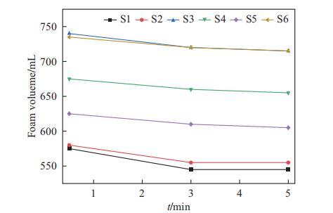 表面活性劑復(fù)合物的發(fā)泡性能評(píng)估如圖3所示。通常,SMCT體系顯示出比SLES體系更好的泡沫性能(S4 vs S1,S5 vs S2,S3≈S6)。以30秒時(shí)的泡沫體積為例。對(duì)于SLES體系(S1-S3),二元體系S1和三元體系S2(含DG)的泡沫體積相似,約為575 mL,而S3(含海藻糖脂)的泡沫體積約為740 mL。對(duì)于SMCT體系,二元體系S4的泡沫體積約為675 mL,加入DG(S5)后降至625 mL,但加入海藻糖脂(S6)后增加至約740 mL。這表明在二元SLES或SMCT體系中加入DG并未增強(qiáng)發(fā)泡性能。然而,在含有海藻糖脂作為輔助表面活性劑的復(fù)合物S3和S6中觀察到了協(xié)同效應(yīng)。這種增強(qiáng)的發(fā)泡效果可能歸因于在SLES和SMCT體系中加入海藻糖脂后表面張力的降低。