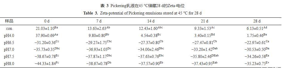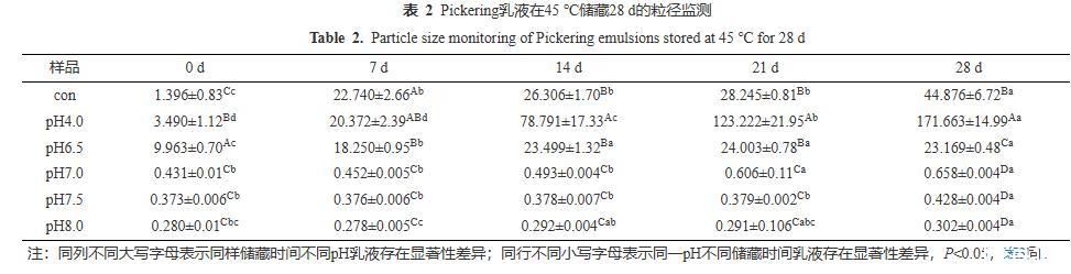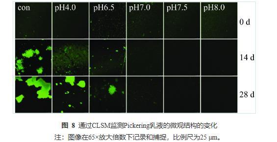 由圖8可知,當(dāng)儲(chǔ)藏14 d時(shí),Con、pH4.0的乳液均出現(xiàn)大面積的油滴聚集,pH6.5的乳液出現(xiàn)局部小聚集,而pH7.0~8.0的乳液微觀結(jié)構(gòu)顯示其分布仍然均勻,無任何油滴聚集現(xiàn)象。當(dāng)儲(chǔ)藏28 d后,Con、pH4.0、pH6.5的乳液中聚集程度明顯加強(qiáng),pH7.0的乳液也有較微弱的局部小聚集現(xiàn)象;而pH7.5與pH8.0的乳液仍保持良好的分布狀態(tài),這與圖7的視覺直觀圖、表2粒徑監(jiān)測和表3電位監(jiān)測的結(jié)果保持一致。CLSM的結(jié)果再次證實(shí)PPP-NP穩(wěn)定的乳液酸性條件下的長期穩(wěn)定性較差,在中性和堿性條件下有著更好的乳液穩(wěn)定性。這一結(jié)果與He等的結(jié)果相似,其所制備的樣品同樣在堿性條件下穩(wěn)定性更高。