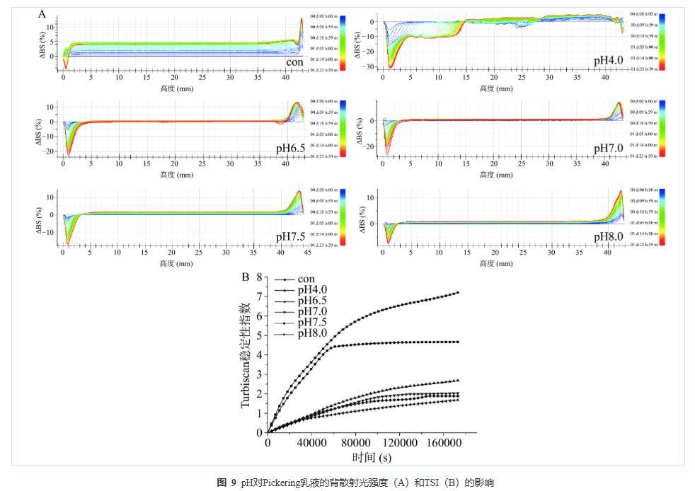 雖然BS可以直觀反映乳液體系的局部不穩(wěn)定現(xiàn)象,但無法量化比較多個(gè)樣品的不穩(wěn)定程度。因此乳液穩(wěn)定性也可以使用TSI值來表征。TSI可以表征多種不穩(wěn)定現(xiàn)象對光強(qiáng)度變化的綜合影響,還可以比較出不同樣品間的穩(wěn)定性差異;TSI值越大,乳液體系越不穩(wěn)定。不同pH制備的PPP-NP穩(wěn)定的Pickering乳液的TSI如圖9B所示。所有樣品的TSI值均隨著掃描時(shí)間的增加而增大。從圖9B可以看出,乳液穩(wěn)定性結(jié)果為pH8.0>pH7.5>pH7.0>pH6.5>pH4.0>con。這與圖7的儲(chǔ)藏穩(wěn)定性直觀圖相一致。在瓶裝直觀圖中,肉眼僅方便觀察并記錄由乳液液滴上升引起的乳液分層,然而,在TSI測量中,TSI值不僅記錄了分層現(xiàn)象,而且還記錄了絮凝和聚結(jié)。絮凝和聚結(jié)被認(rèn)為是乳液穩(wěn)定性中影響因素的一部分。因此TSI值的變化能更全面、系統(tǒng)的表征乳狀液體系的穩(wěn)定性。