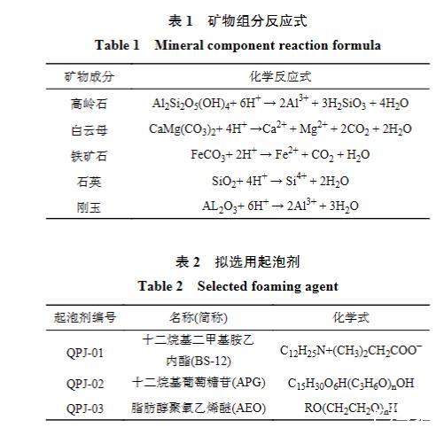 圖1為2口低產(chǎn)井采集樣品的X射線衍射結(jié)果。可以看出,2種無機礦物樣品中硅酸鹽巖成分占比大,因此選用乙酸、鹽酸、氫氟酸3種常規(guī)酸液進行無機礦物溶蝕試驗,理想狀態(tài)下礦物組分被單一酸液的侵蝕過程見表1。選用的3種常見起泡劑分別為:十二烷基二甲基胺乙內(nèi)酯(BS-12)、十二烷基葡萄糖苷(APG)、脂肪醇聚氧乙烯醚(AEO),見表2。其中BS-12為兩性離子型起泡劑、APG為陰?非離子型起泡劑、AEO為非離子型起泡劑。