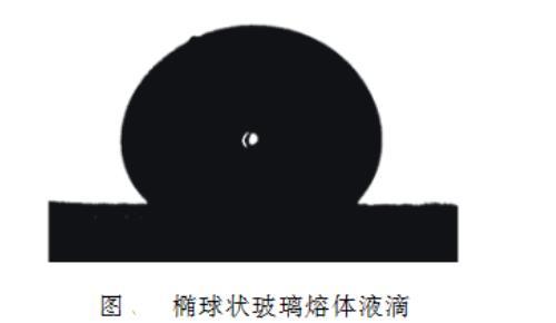 將制備的玻璃樣塊用錫紙包裹,用鐵錘捶碎后用鉗子修整成較方正的顆粒,選取內(nèi)部無(wú)氣泡結(jié)石且質(zhì)量為 0.15~0.30 g 的碎塊用于測(cè)試。測(cè)試前選用 T? 溫度表面張力為 334 mN/m 的標(biāo)準(zhǔn)鈉鈣玻璃校準(zhǔn)表面張力測(cè)量?jī)x。測(cè)試的具體操作步驟如下:將表面張力測(cè)量?jī)x加熱爐升溫至測(cè)量溫度,通入高純氮?dú)庾鳛楸Wo(hù)氣體,然后將制備好的玻璃樣品置于石墨片上,送入加熱爐中的樣品臺(tái)上進(jìn)行保溫,試樣在表面張力作用下收縮成橢球狀液滴,如圖 2 所示,將液滴置于拍攝裝置視野中心,保溫 30 min 至熔體穩(wěn)定。隨后,用圖像采集裝置獲取橢球熔體的外輪廓線,通過(guò)軟件數(shù)值分析得到輪廓參數(shù),利用 Young-Laplace 方程進(jìn)行解析,計(jì)算出樣品的表面張力(σ),反復(fù)測(cè)試若干次后取 σ 的平均值為樣品在該測(cè)試條件下的表面張力值。