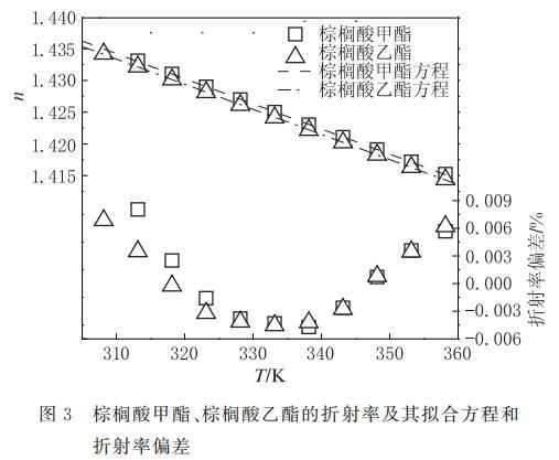 圖3 棕櫚酸甲酯、棕櫚酸乙酯的折射率及其與方程(4)計(jì)算值的偏差