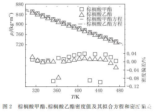 圖2 棕櫚酸甲酯、棕櫚酸乙酯的密度及其與方程(2)計(jì)算值的偏差