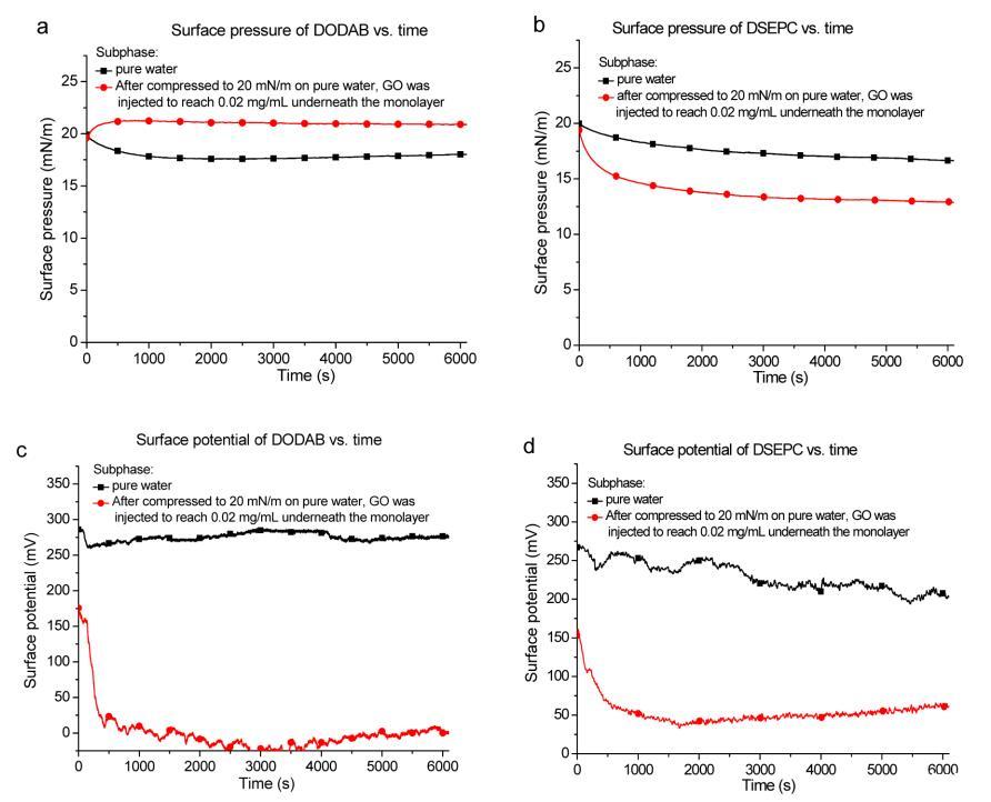 圖 2. (a) DODAB 和 (b) DSEPC 單層的表面壓力與經(jīng)過時(shí)間的關(guān)系。 單層的表面電位與經(jīng)過時(shí)間的關(guān)系 (c) DODAB 和 (d) DSEPC。 黑色曲線:單層在純水亞相上被壓縮到 20 mN/m 的表面壓力。 紅色曲線: 將單層壓縮至 20 mN/m 后,將 600 μL 1 mg/mL GO 分散體小心緩慢注入單層下方 進(jìn)入水亞相以達(dá)到 0.02 mg/mL 的 GO。