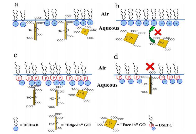 圖 3. GO 并入 DODAB (a, b) 和 DSEPC (c, d) 單層時(shí)可能取向的示意圖 氣水界面。