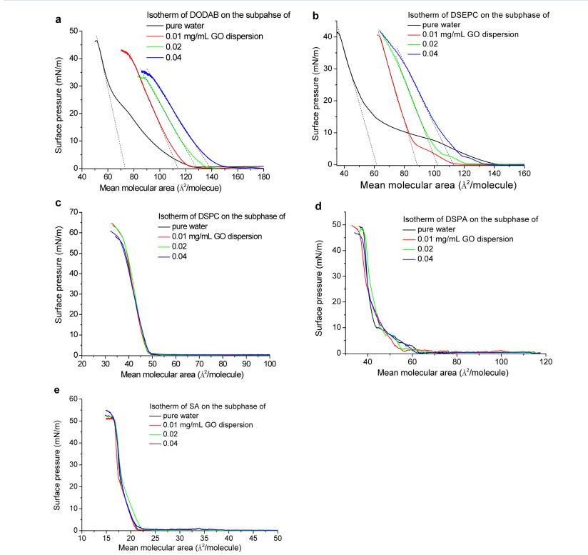 圖 1. 空氣-水或 GO 分散界面處脂質(zhì)的表面壓力-面積等溫線:(a) 帶正電荷的 DODAB; (b) 積極 收費(fèi) DSEPC; (c) 帶中性電荷的 DSPC; (d) 帶負(fù)電的 DSPA; (e) 帶負(fù)電的 SA。 請注意,沒有表面壓力 在空氣-GO 分散界面處檢測到,而沒有在界面處擴(kuò)散脂質(zhì)。 每個(gè)分子軸面積的虛線的截距 表示每個(gè)分子的極限面積。