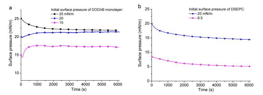 圖 4. GO 在不同表面的 (a) DODAB 和 (b) DSEPC 單層的吸附研究(表面壓力與經(jīng)過時(shí)間) 壓力。 單層首先在純水亞相上壓縮到一定的表面壓力,然后 600 μL 1 mg/mL GO 分散體 被小心地緩慢注入單層下方的水亞相中。