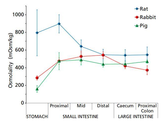 三種動物模型的胃腸內容物的滲透壓通常遵循相同的趨勢,胃低,近端小腸增加,遠端減少。豬似乎沿著這種模式一直到盲腸,在結腸處進一步輕微增加(圖2)。然而,在大鼠中,由于胃滲透壓的高度可變性,胃內容物的滲透壓與近端和中端小腸的滲透壓沒有統計學差異。這種滲透壓模式通常與消化系統的生理學相一致,在消化系統中,大多數食物在小腸中被消化并分解為葡萄糖、氨基酸和脂肪酸等組成成分,因此液體的滲透壓較高。隨著營養被腸道進一步吸收,內容物的滲透壓降低。
