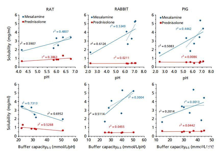 需要注意的是,Fadda等人[11]報告了使用體液的相關性 未考慮胃液中的溶解度,這在此處介紹的動物液中的相關性中得到了解釋。有趣的是,在排除動物液中的胃溶解度后,人和動物液中的相關性變得相似(圖5中的虛線) 此外,盡管區域pH值和緩沖容量較高,但豬遠端小腸的平均溶解度并不高于中小腸(表1),這可以通過該區域較高的表面張力(44±6 vs.35±3)來解釋 表面張力與美沙拉秦在兔子體內的溶解度之間存在一定的親和力(標準化系數β)= ? 0.802,P=0.055;r2=0.643)。需要注意的是,用于產生這些相關性的pH值對應于液體上清液中的測量值,這不一定與腸道中的原位pH值相關。