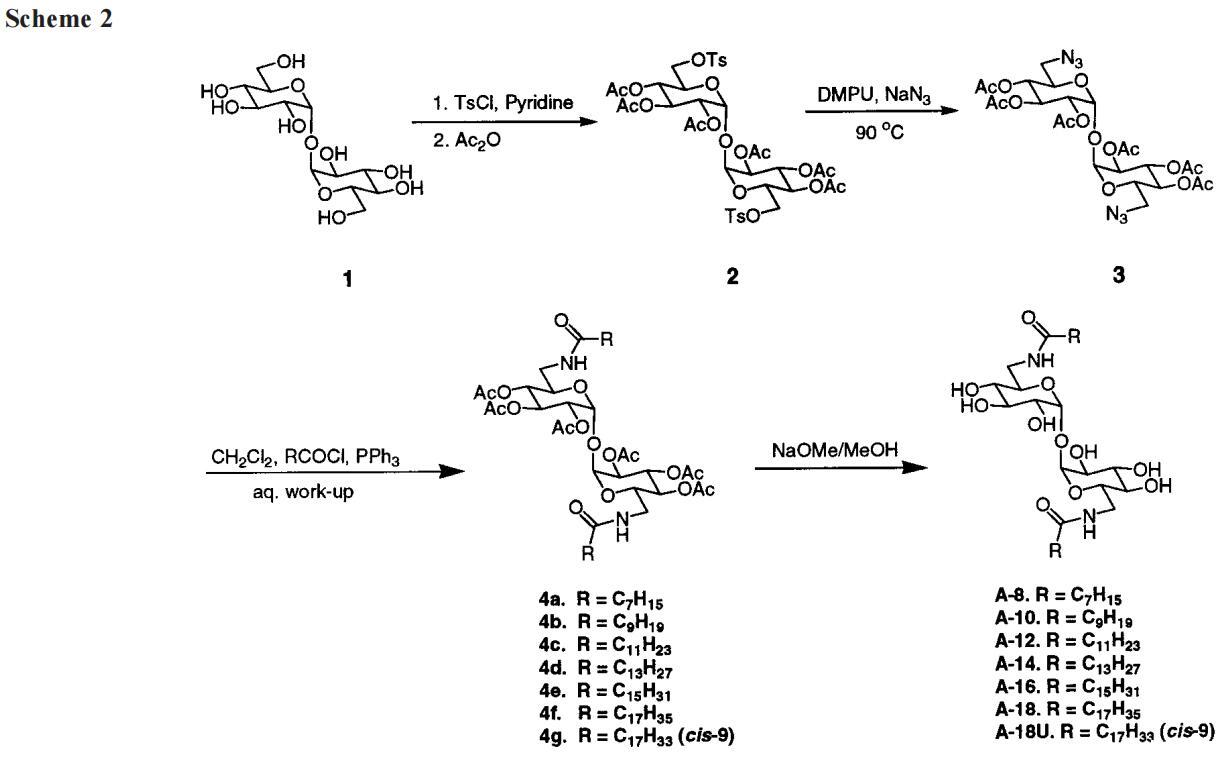 我們的第一個驚喜是發現A系列海藻糖雙子座不溶于水。例如,A-12、A-14和A-16(指鏈長的數字)在1毫升溫水中旋轉2毫克時會留下沉淀物。即使在70°C的溫度下,A-10也會在這種處理過程中形成渾濁的懸浮液。A-8在室溫下的可溶濃度僅為1-2 mM(根據動態光散射,在該濃度下,會形成膠束大小的聚集體)。天真地說,人們可能會認為a-8的溶解度大得多,因為該分子由六個羥基和兩個酰胺組成。盡管相關的6-氨基-6-脫氧己糖衍生物需要加熱才能溶解,25許多烷基化單糖(例如,辛基葡萄糖苷和甲基6-O-(N-庚基羰基)-R-D-吡喃葡萄糖苷或下面的“Hecameg”)是水溶性的。然而,A-8并沒有類似的天賦。這里的教訓是,用一句老生常談的話來說,我們的雙子座比其各個部分的總和要多(或少)。不管老生常談與否,雙子座的獨特屬性都取決于它。