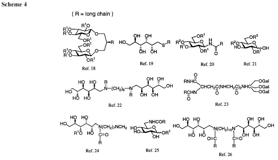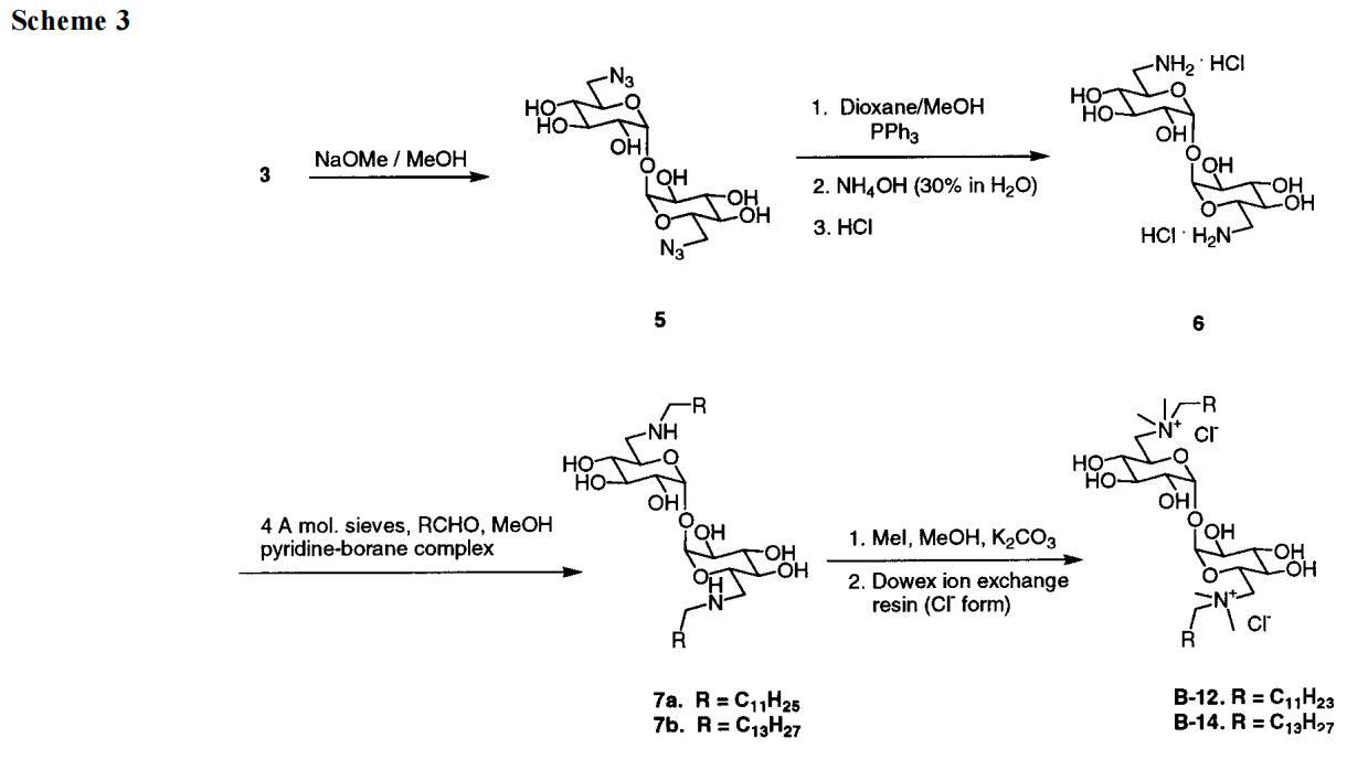 接下來,我們提出了在海藻糖衍生物上放置陽離子基團以改善其水溶性的想法。必須承認,我們對更易管理的水溶性化合物的前景感到一定程度的高興。B系列就這樣出現了。然而,我們立即面臨新的問題。雖然B-12和B-14是作為純化合物獲得的,但B-16和B-18并非如此。后兩種Gemini的產率較低,提供了令人滿意的光譜數據,但它們的元素分析偏離了理論1-2%(這使我們懷疑存在無機雜質)。無論如何,由于B-16和B-18不符合我們的高純度標準,我們在注意力上輕視了它們,而偏愛它們的矮表親。