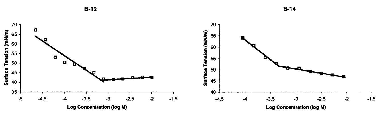 圖4。室溫下測定B-12和B-14臨界膠束濃度的張力測定圖。B-14混合后立即進行測量,而B-12樣品老化20分鐘。