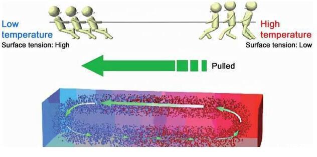 在兩種液體相互接觸的時候,表面張力強的液體會將表面張力弱的液體拉過來,這股力會將表面張力弱的液體反向倒吸進表面張力強的液體之中,科學家將這一現象命名為馬拉高尼效應。導致這一現象發生的條件有很多,比如液體的濃度含量,溫度的高低都會讓兩種液體產生馬拉高尼效應。