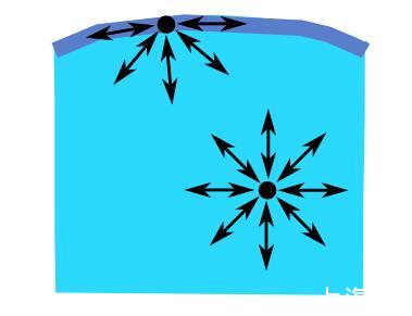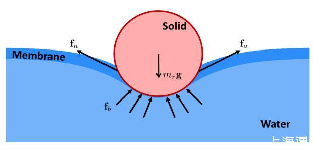 其中是流體表面的面積,稱為表面張力系數(shù)。當(dāng)流體與固體發(fā)生作用時,流體表面的分子同時會受到固體分子的作用,從而將表面張力作用在固體上。固體根據(jù)表面特性不同可以分為親水和疏水兩類,疏水材質(zhì)在水面上會受到向上的表面張力作用,對于一些細小的結(jié)構(gòu)來說這個力要比浮力更為明顯。比如說水黽是一種可以生活在水面上的昆蟲,它的腳非常細長,并且有很多絨毛來保持疏水特性,因而水黽可以依靠表面張力維持自身的重量,并通過腳來劃動水面來向前運動甚至跳起。