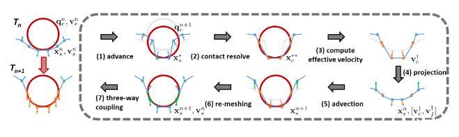 我們的耦合系統(tǒng)分為三個部分:流體,表面層,固體。流體部分我們采用傳統(tǒng)的歐拉網(wǎng)格的模擬方法,在交錯網(wǎng)格(Staggered Grid)上用算符分離的方法求解離散不可壓的Navier Stokes方程。固體部分采用傳統(tǒng)的拉格朗日方法求解牛頓方程。我們的主要貢獻在于在流體與固體之間插入了一層有質(zhì)量、有厚度的流體表面層,這個表面層直接對應(yīng)我們上面介紹的流體表面分子稀疏的部分。因為這個表面層非常薄,我們可以使用帶虛擬厚度的單層三角網(wǎng)格來表示,然后在這個表面層上施加表面張力勢能。為了將這三個部分耦合起來,我們在表面層和背景網(wǎng)格、固體和背景網(wǎng)格之間定義了速度的插值矩陣,同時將流體的壓強作用在表面層和固體上,以及將表面張力作用在固體上,這樣我們將這三部分寫進一個三相耦合方程里進行統(tǒng)一求解和更新。最終我們算法的流程如下:
