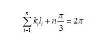 假設(shè)二維干泡沫中的任一氣泡如圖3b所示,氣泡的邊數(shù)為n,從a點開始,再回到a的邊長分別標(biāo)記為l1到ln,每邊所對應(yīng)的曲率為k1到kn(Plateau第一定律)。現(xiàn)在假設(shè)有一點從a點沿著邊向b運動,到b點時,所走的路徑為l1,轉(zhuǎn)動的角度為這條邊所對應(yīng)的圓心角(向外為正,向內(nèi)為負(fù)值),為k1*l1。此時要想繼續(xù)沿著邊運動,需要向內(nèi)轉(zhuǎn)動π/3角度(根據(jù)Plateau第二定律),如圖3b所示。轉(zhuǎn)動后繼續(xù)運動,直到到達原來的點a。此過程,n條邊總共在頂點處轉(zhuǎn)動的角度為nπ/3,在邊上轉(zhuǎn)動的角度為
