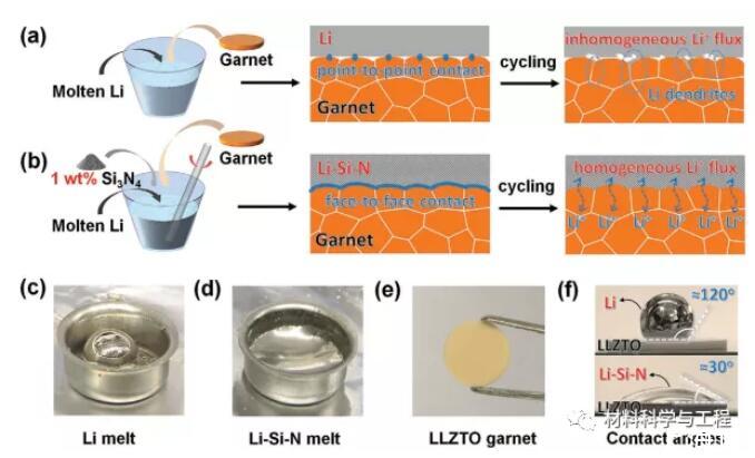 圖1.示意圖顯示了a)純Li熔體和b)Li-Si-N熔體的制備及其與石榴石顆粒的界面接觸行為。