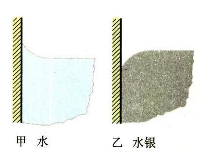 那有沒有玻璃分子不喜歡的人呢?當然,水銀分子相對于玻璃就是非浸潤液體,所以我們會觀察到,沒有器壁玻璃分子的拉力,試管內的水銀液面就?是凸出來的。