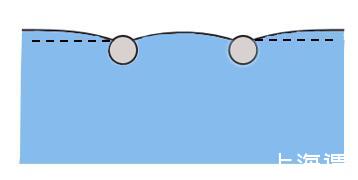 麥片圈效應中使得麥片相互吸引的因素是麥片之間的橫向毛細力(Lateral Capillary Force),橫向毛細力可分為吸引力和排斥力,這里表現為吸引力。我們通過一個簡單的例子,來說明一下橫向毛細力產生的原因。首先考慮單個小球放置在液面上保持平衡,意即在重力的作用下對液面形成一個擾動,此時若液面上存在另外一個小球時,這種擾動會相互疊加,下圖中的液面便是最終的擾動狀態。