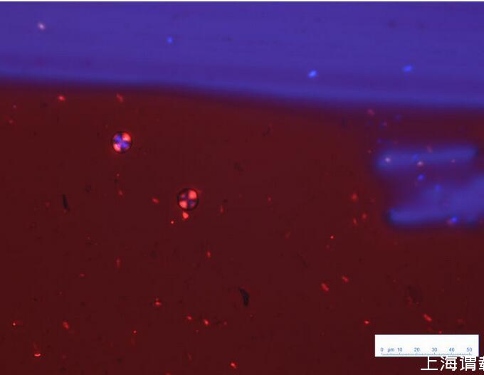 紅色的部分為墨水殘余物的涂片,藍(lán)紫色是載玻片本身在偏光鏡下的顏色。圖中可以看到兩個標(biāo)準(zhǔn)的馬耳他十字,基本上能夠驗證“sheen是結(jié)晶導(dǎo)致”這一說法