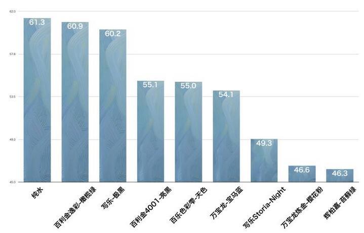 1.達(dá)到60mm接近純水的【高流動性組】,代表樣本為【百利金逸彩橄欖綠】、【寫樂極黑】;