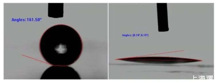反之,對于疏水表面,固液界面處的表面張力可能非常大,以至于接觸角只有達到鈍角甚至趨近于180°才能達到平衡,此時的現象稱為非浸潤或者不能浸潤。而這種表面由于較高的疏水性被稱為超疏水表面。