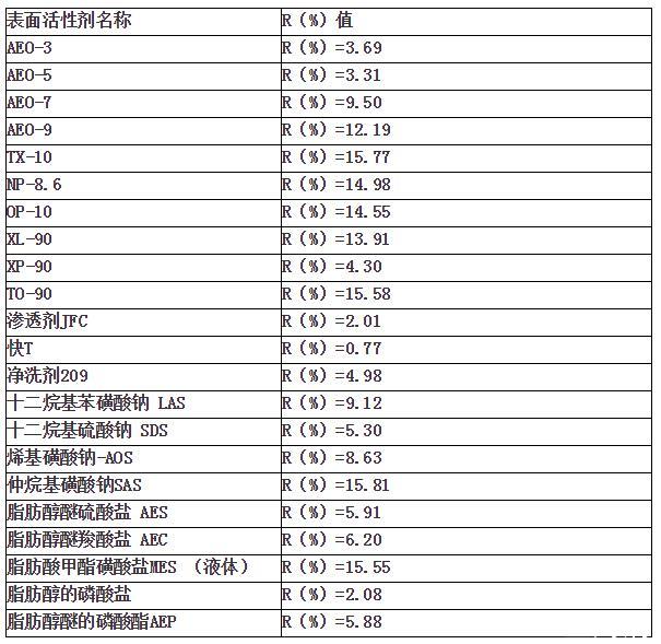 R值越大,表明凈洗能力越強(qiáng),該測試標(biāo)準(zhǔn)可用來表征表面活性劑對一般污垢的去除,不適用于反映油脂和蠟質(zhì)的去除能力。