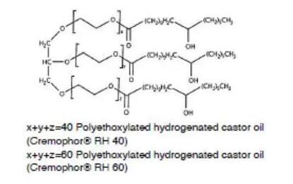 另一類重要的非離子表面活性劑是聚氧乙烯蓖麻油(Cremophor)或聚氧乙烯氫化蓖麻油(Cremophor RH)。蓖麻油是蓖麻油甘油三脂,與環(huán)氧乙烯反應(yīng),親水性的氧化乙烯結(jié)構(gòu)便插入到蓖麻酸和甘油之間,便得到了聚氧乙烯蓖麻油,如果蓖麻油中的雙鍵加氫飽和后,再與環(huán)氧乙烯反應(yīng),那么得到的便是聚氧乙烯氫化蓖麻油。環(huán)氧乙烯和蓖麻油的反應(yīng)位點(diǎn)是隨機(jī)的,因此得到的表面活性劑是一種混合物,也包括未反應(yīng)的蓖麻油和均聚形成的聚氧乙烯。不同種類的聚氧乙烯蓖麻油或聚氧乙烯氫化蓖麻油是通過參與反應(yīng)的氧化乙烯和蓖麻油或氫化蓖麻油的比例決定的,例如Cremophor EL 40或Cremophor RH 40,其中40代表的便是混合物中氧化乙烯和蓖麻油的摩爾比。這類表面活性劑的HLB一般在12以上,常用作難溶性藥物的增溶。