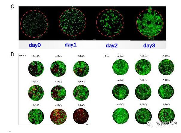 圖4A.微流控腫瘤微陣列藥物測試系統包含一種復合式結構開放式微流控芯片以及移液工作站;B.微流控芯片上腫瘤微環境重建的示意圖。3D培養腫瘤細胞模擬腫瘤實質,水凝膠模擬支持和滋養腫瘤細胞的腫瘤基質,納米孔薄膜擴散屏障模擬血管內皮層;C.微流控芯片上連續三天內MCF-7乳腺癌細胞增殖情況。(Calcein-AM/EthD-1染色,比例尺:200μm);D.抗腫瘤藥物正交組合測試結果。藥物測試包括LO2肝細胞和MCF-7乳腺癌細胞對A.阿霉素,B.紫杉醇和C.順鉑的3因素3水平正交組合藥物的反應。